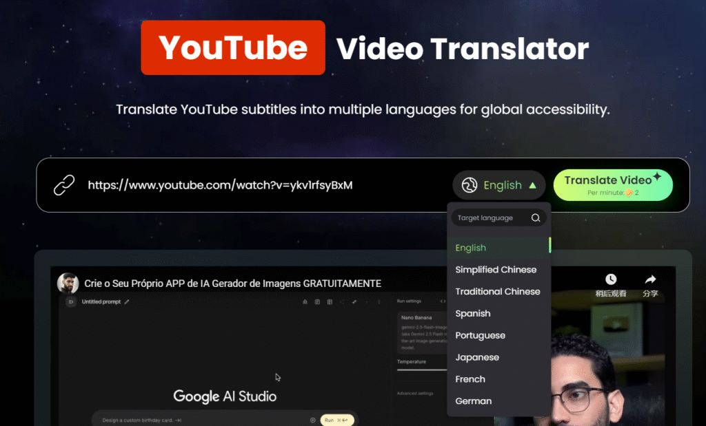 1. One-Click Translation: Users simply paste a YouTube video URL into the tool. No downloads or complex setups are required.