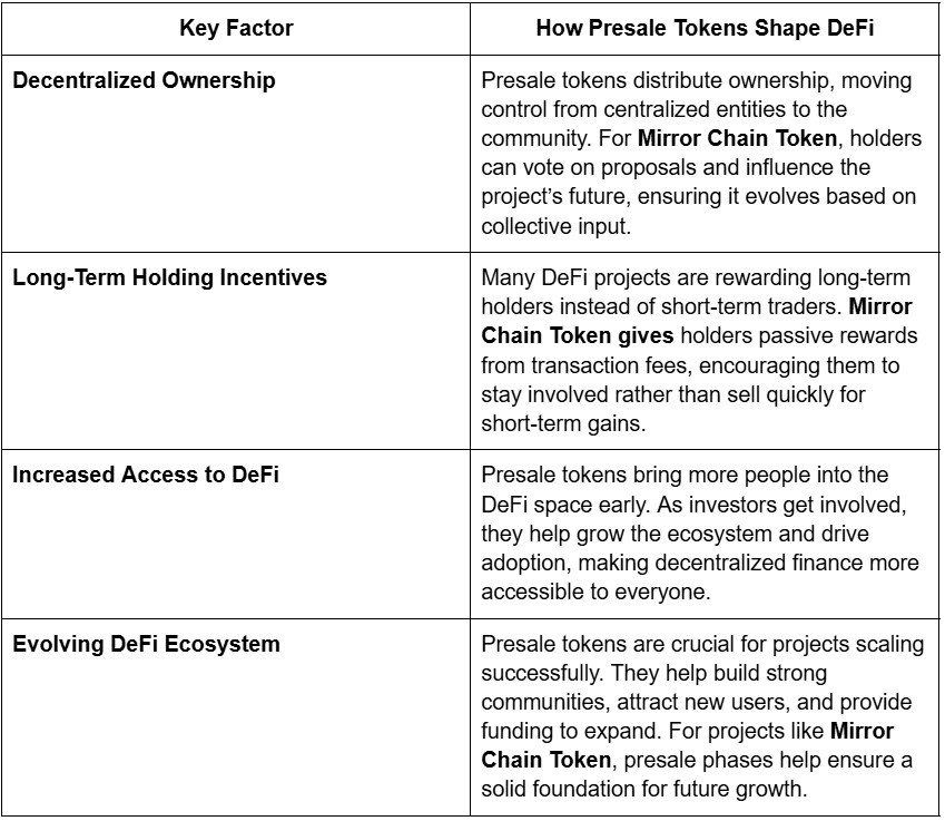 Presale tokens are not merely a mechanism of accessing an early entry point to a crypto project. Their actions are contributing to the future of DeFi through the process of decentralization, encouraging long-term ownership, and making the benefits of decentralized finance available to more people. The presale tokens are increasingly becoming an important component of the way DeFi platforms are developed and deployed with projects such as Mirror Chain Token.