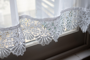 Chantilly lace is also used in decorative cushions, curtains, and table covers. Chantilly lace details provide a sense of sophistication and softness to a given space.