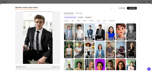 Click “Edit more” to fine-tune voice timing, tweak scripts, or modify facial expressions for frame-by-frame accuracy. Add text overlays or background music to complete the edit.