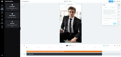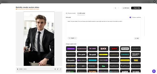 Click on “Edit script” to refine dialogue line by line. The avatar lip-syncs text accurately in multiple languages. Use “Change caption style” to match captions with timing and visual tone for greater control.