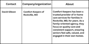 “Providing professional care with consistency, compassion, and respect is at the heart of what we do,” said David Gibson, owner of Comfort Keepers of Rockville, MD.
