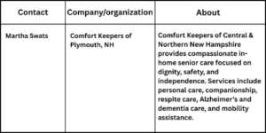“Memory loss changes daily life, but compassionate support and familiar surroundings bring comfort and reassurance. Our caregivers focus on dignity, patience, and meaningful connection, helping seniors feel safe, respected, and supported at home,” said Martha Swats, owner of Comfort Keepers of Plymouth, NH.