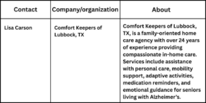 “Providing consistent home care for seniors with Alzheimer’s helps them stay active, safe, and engaged, giving families the reassurance their loved ones are supported every day,” said Lisa Carson, owner of Comfort Keepers of Lubbock, TX.