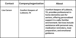 “Providing dementia care at home helps seniors stay engaged and secure while giving families confidence and peace of mind that their loved ones are in capable hands,” said Lisa Carson, owner of Comfort Keepers of Lubbock, TX.
