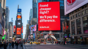 Most companies make promises in fine print. TICKETS.US put theirs on a billboard in Times Square.