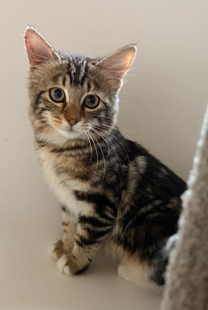 Jupiter is a female domestic medium hair kitten, around 4 months and 3 weeks old. She has a brown tabby coat with white markings and soft, medium-length fur that may grow longer as she gets older.