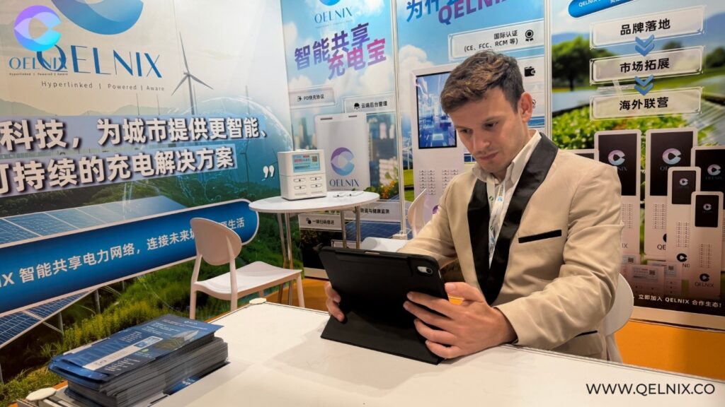 During the exhibition, QELNIX showcased its modular shared power bank stations, designed for deployment across high-traffic environments such as shopping malls, airports, campuses, and urban lifestyle hubs. With flexible configurations ranging from compact units to large-scale multi-slot stations, the solution demonstrates strong scalability for diverse operational needs.